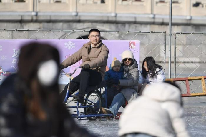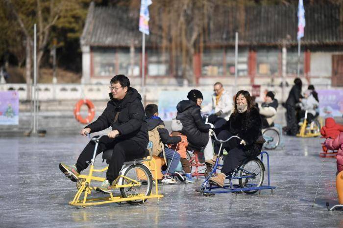 白塔相映的冰面上,孩童蹬着卡通冰车追逐嬉戏,成年人骑着冰上自行车重温童年,亲子结伴滑行的身影随处可见,欢声笑语中尽显冬日活力。