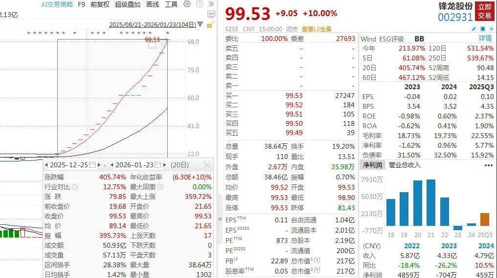作为2026年开年的“超级大牛股”,锋龙股份停牌前录得18连板,近20个交易日股价涨超400%,公司收盘价99.53元/股,总市值217亿元。