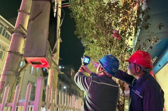 2月19日晚,南方电网广西河池环江供电局保供电人员对“返乡村”篮球比赛赛场周边供电线路和设备开展红外测温。韦家会摄
