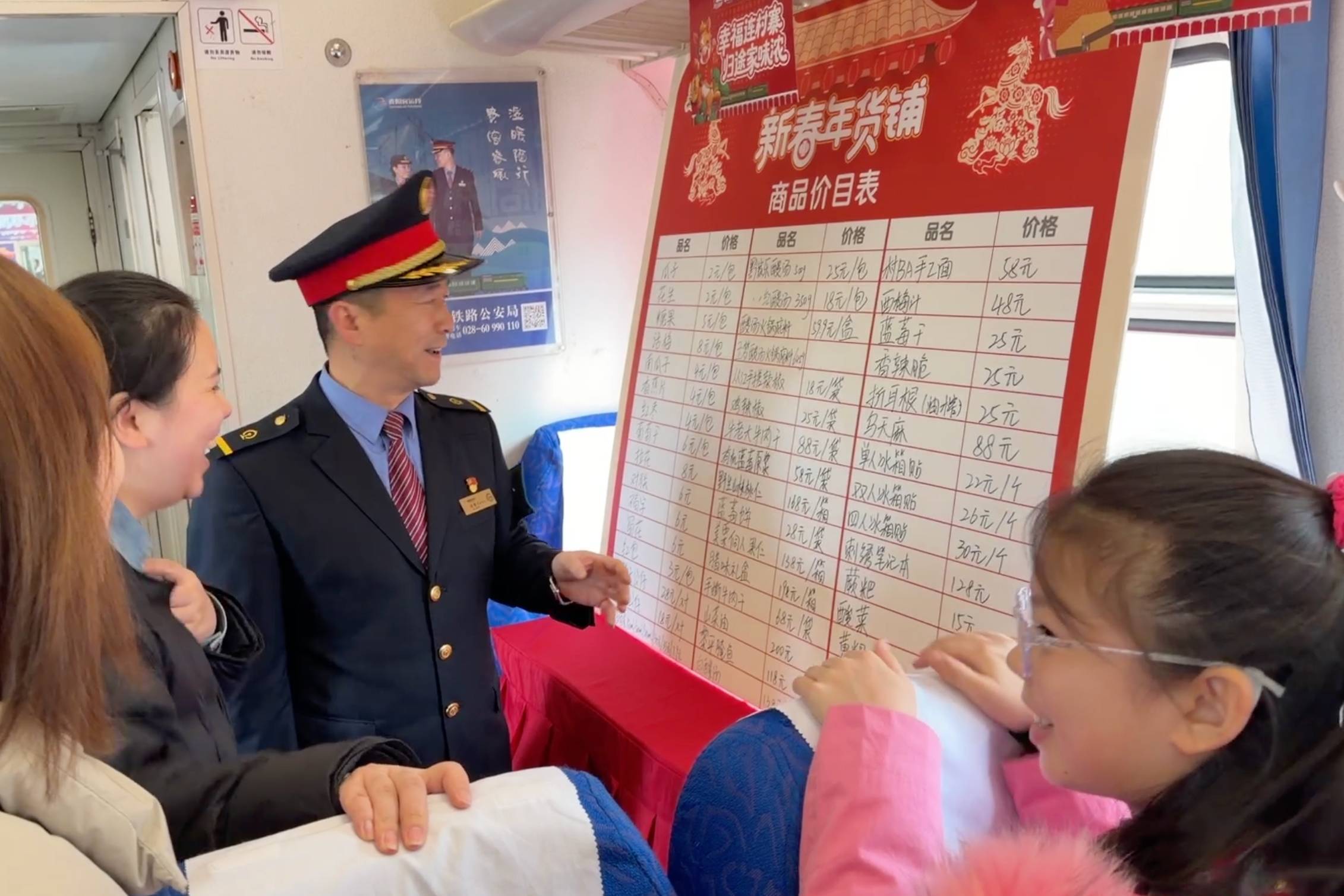 5640次列车列车长胡贵川向旅客介绍年货价格。(国铁成都局集团公司贵阳客运段供图)被网友称为“带货车长”的胡贵川穿梭在车厢中,从最初的帮老乡吆喝卖菜,到建立“绿皮火车超市”微信群,他与班组将服务做到了乡亲们的心坎里。今年春运,非遗展示、邮政主题、村火车大舞台等车厢同步开放,让这列慢火车成为展示乡村振兴成果的窗口。