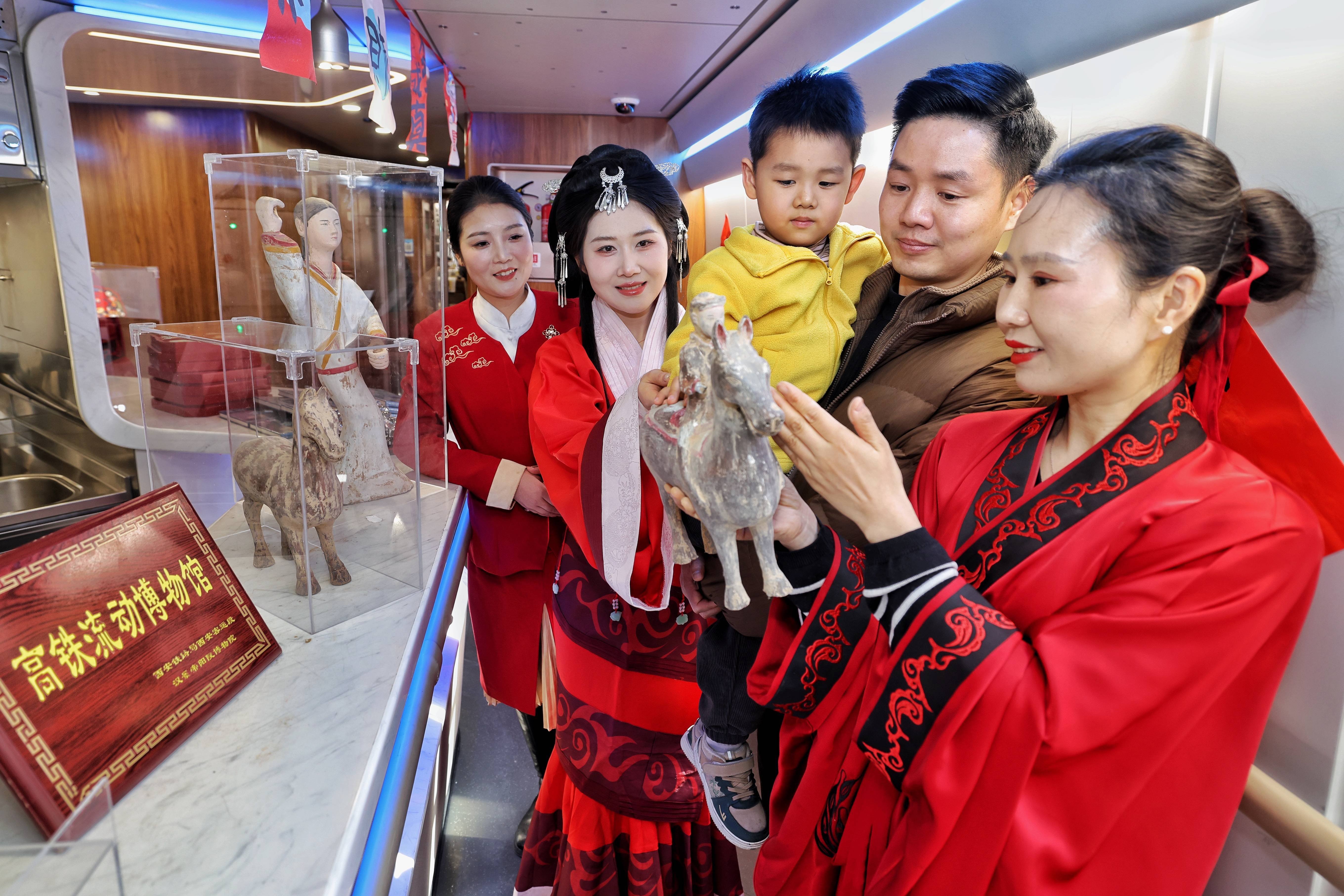 2月11日,西安北开往香港西九龙的G916次陕港高铁列车上,身着汉服的工作人员向旅客展示汉代马形文物复制品,并讲解相关历史文化。(国铁西安局集团公司供图)当春运大潮遇见传统文化,当钢铁动脉注入人文温度,“流动中国”与“文化中国”正沿着万里铁道线交融共生。