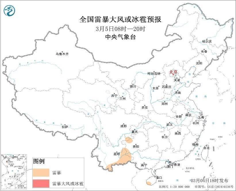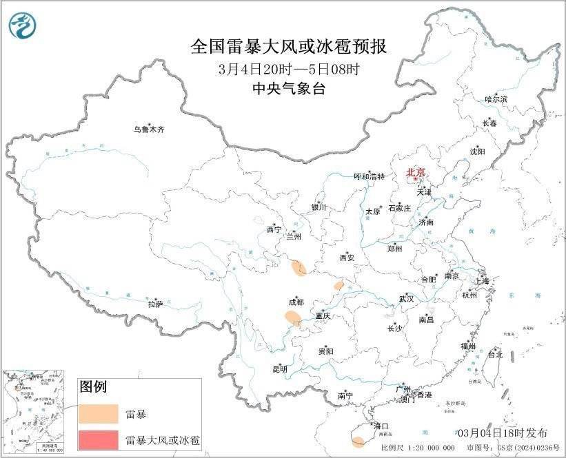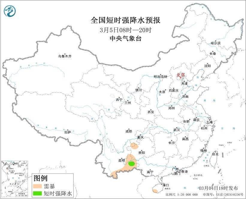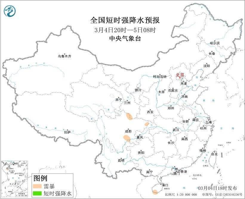 r预计3月4日20时至5日20时,云南东南部局地有短时强降水,小时雨量20~30毫米;甘肃南部、四川盆地西部、贵州西部、云南东部和南部、广西西北部、海南岛西南部等地的部分地区将有雷暴。