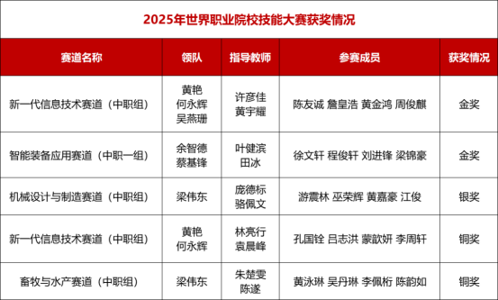 至此,广州市轻工职业学校在2025年世界职业院校技能大赛总决赛争夺赛中圆满收官,取得2金1银2铜的骄人战绩,分别是新一代信息技术赛道金奖、铜奖,智能装备应用赛道金奖、机械设计与制造赛道银奖、畜牧与水产赛道铜奖。