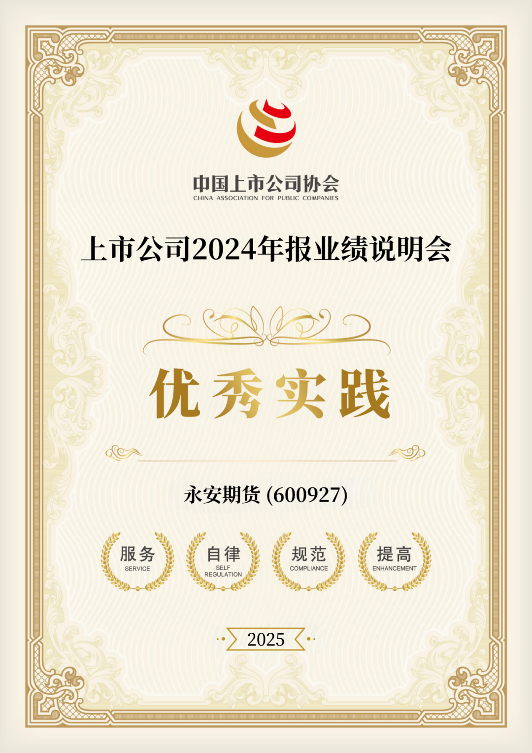 近日,中国上市公司协会公布上市公司2024年报业绩说明会优秀实践案例评选结果,永安期货凭借在投资者关系管理方面的扎实工作与创新实践,成功获评“优秀实践”案例,这一荣誉不仅是对公司业绩说明会组织水平与沟通成效的高度认可,更是对永安期货始终坚持“以投资者为本”理念的生动印证。